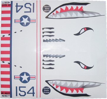 - Inspired by the Flying Tigers, this is a Navy Shark plane from 1942 with exhaust, bullet holes, squadron stripes, pilot ID 154, and 3 Zero planes downed.- The kit is a total of 30 different decal pieces (15 pieces mirrored left and right). Overall length on the sheet is 9 x 8.25 inches