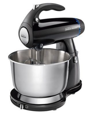 This Sunbeam stand mixer is a powerful presence in your kitchen, boasting 12 variable speeds and chrome beaters that mix everything from batches of batter to mountains of dough in no time flat. Black with chrome accents. Model 2594.