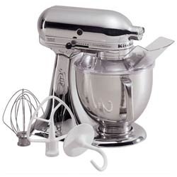 Try this KitchenAid Stand Mixer once and it'll quickly become your indispensable kitchen aid. The Custom Metallic Stand Mixer series is designed for the cook who wants to upgrade from a hand mixer, but doesn't require the massive power of a commercial-grade model. KitchenAid Custom Metallic Mixers feature a five-quart mixing bowl with helpful handle, and 10 speeds ranging from a slow stir to a brutal whip. The tilt-head design lets you secure attachments to the shaft with a simple twist. This model includes a dough hook for kneading up to four loaves of bread dough;a wire whisk to efficiently whip cream and egg whites;and a flat paddle for batter, cookie dough, meat loaf and everything in between. you'll also receive a pouring shield to contain splatters and direct ingredients into the bowl while the mixer is running. Planetary mixing action spins the beater clockwise as the shaft spins counter-clockwise, so the beater reaches 67 different points around the bowl to thoroughly mix ingredients. And at 22 pounds, you can be sure this baby will stay put during use unlike lesser models that dance across the counter under strain. This rugged mixer does require a bit of counter space, but with so many uses, you'll never want to store it anyway. Plus, you'll be proud to display this beautiful appliance featuring the KitchenAid name and bright color choices designed to match any kitchen dcor. Tip from our Test Kitchen: If you encounter equipment or mixing problems, scan the included instruction booklet. KitchenAid has done a great job addressing everything from difficulty removing attachments to adjusting the bowl height for improved mixing! 325 watts of mixing power 5-quart mixing bowl 10 mixing speeds Tilt-back head for easy attachment use and cleaning Planetary mixing action Direct-drive all-steel gear transmission Locking motor head Included attachments: C dough hook, nylon-coated flat beater, wire whip Includes two-piece pouring shield Accepts all optional KitchenAid