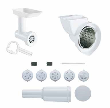 - Attachment pack greatly expands a stand mixer's flexiblity- Pack includes food grinder, slicer and shredder, and pouring shield